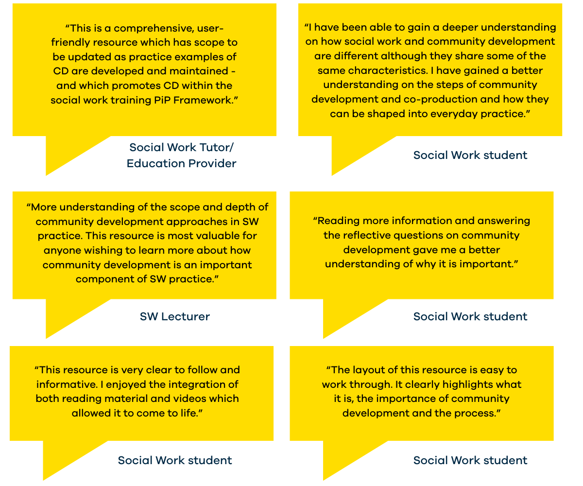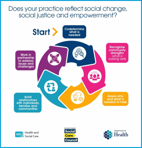 The Northern Ireland Social Care Council in partnership with Fergal O’Brien (Regional Programme Coordinator, SWCDA), Robbie McCague (Inequalities and Inclusion Coordinator, SHSCT) and Eugene Kerlin (Regional Digitalisation and Promotions Lead for Social Work, WHSCT) have developed a new Community Development for Social Work digital learning resource. This resource has been developed to support social workers to learn more about community development and how to apply a community development approach in their practice.